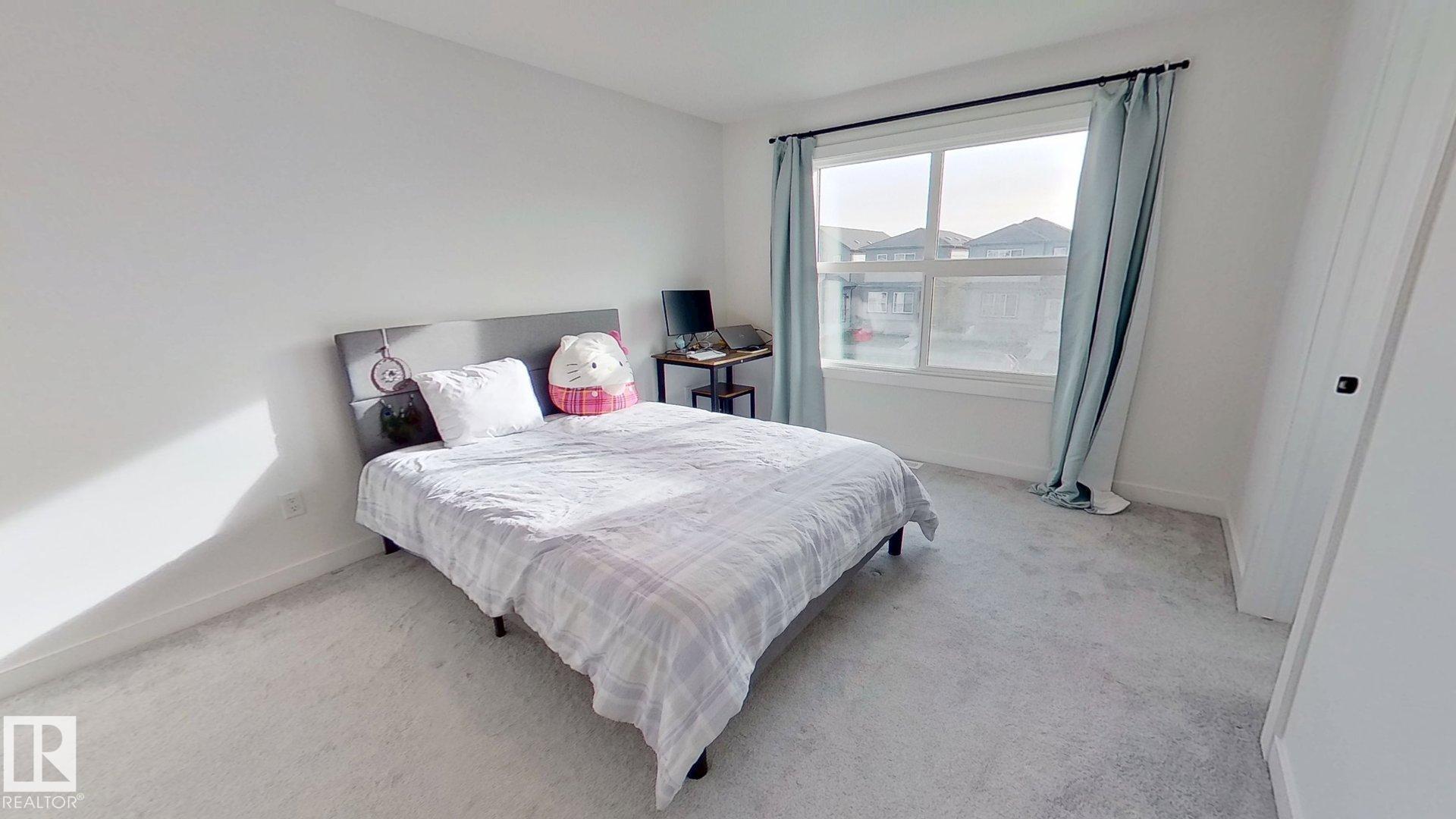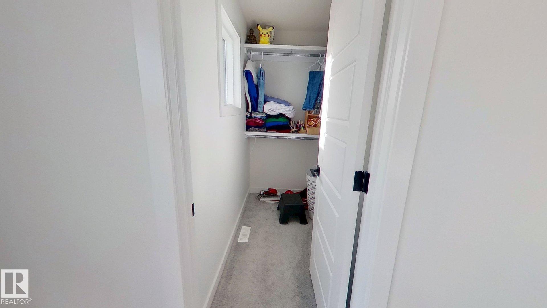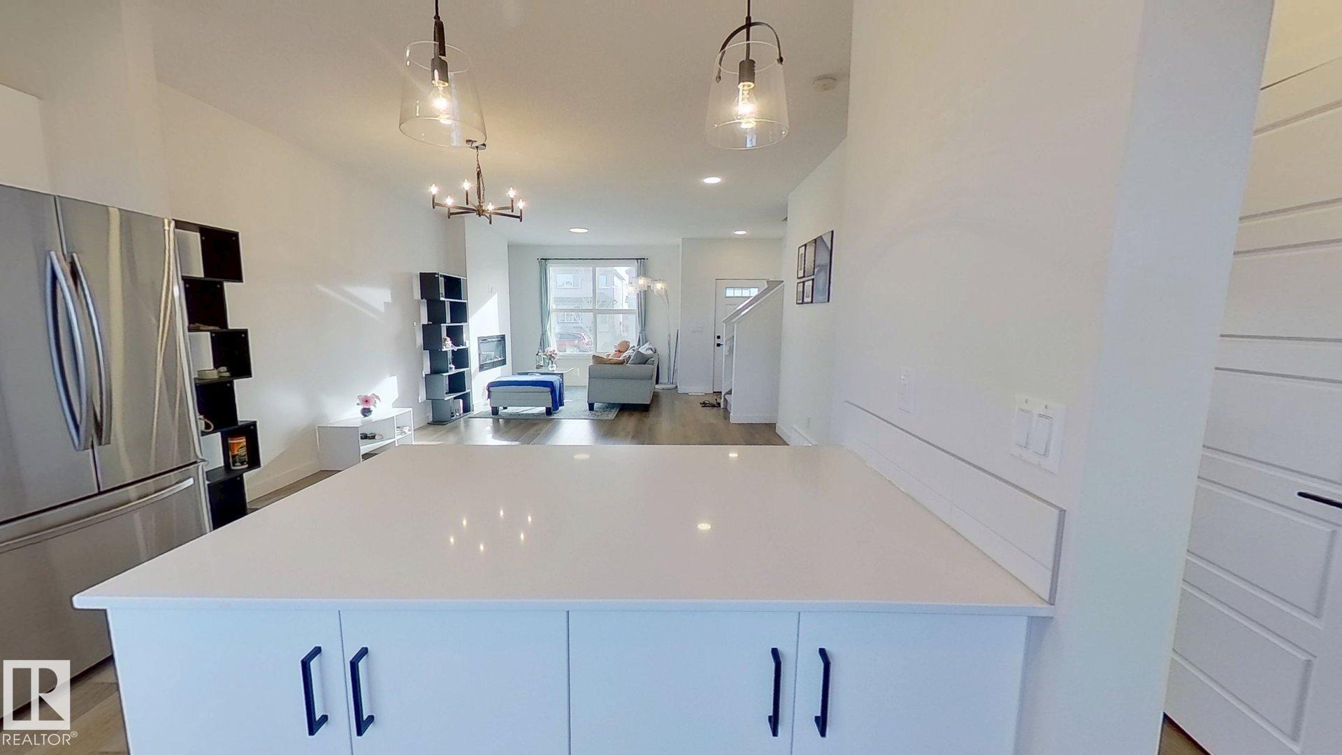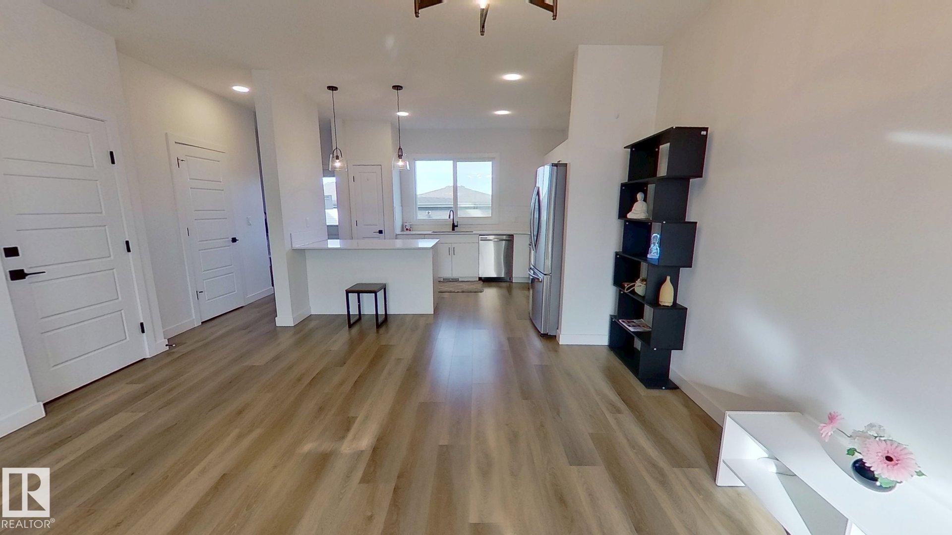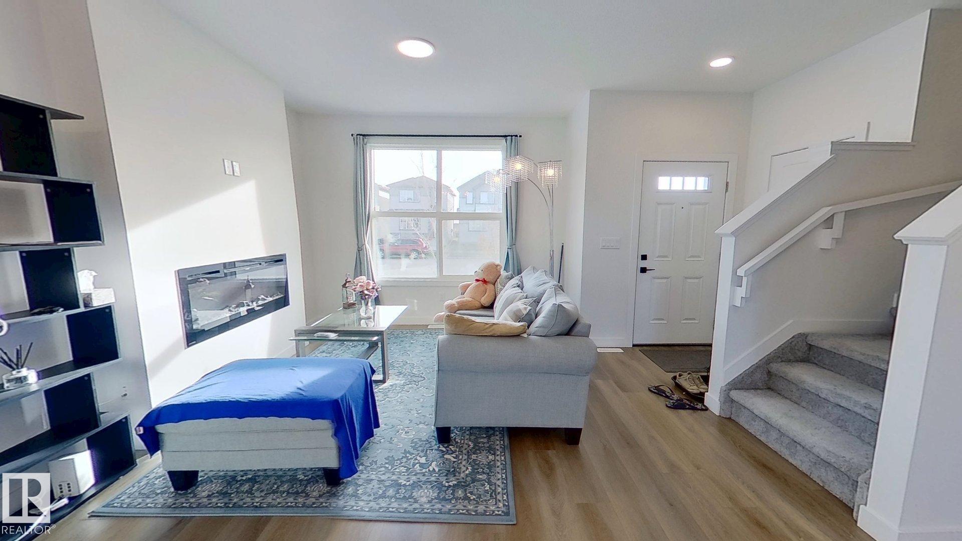 2022-built, 1,410 sq ft two-storey home by Alquinn Homes in Fort Saskatchewan. Main floor features an open-concept layout with luxury vinyl plank flooring, custom MDF shelving/cabinets, electric fireplace, large living & dining area, kitchen island with generous counter space and a 2-piece bath. Upper level offers 3 bedrooms and a 4-piece main bathroom; the master suite includes a 4-piece ensuite and walk-in closet with MDF shelving. Separate side entrance plus rear entrance. Fully-landscaped yard with part...